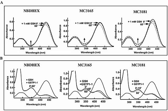 Figure 2: Reactivity with GSH of NBDHEX, MC3165 and MC3181. (A) UV-visible spectra of NBDHEX, MC3165 and MC3181 (40 μM, in 0.1 M potassium-phosphate buffer, pH 6.5, at 25°C) before (solid line), immediately after (dashed line), and 60 minutes after (dotted line) the addition of an excess of GSH (1 mM). Arrows show a small increase in the region around 350 nm indicative of the spontaneous formation of a σ-complex between the compound and GSH. (B) UV-visible spectra of NBDHEX, MC3165 and MC3181 (40 μM, in 0.1 M potassium-phosphate buffer, pH 6.5, at 25°C) before (solid line), 10 minutes (dashed line), and 60 minutes (dotted line) after addition of a stoichiometric amount (40 μM) of GSTP1-1 and of an excess of GSH (1 mM). Upon addition of GSTP1-1, formation of the typical σ-complex band centered at 350 nm was observed.