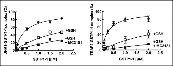 Figure 3: Effect of MC3181 on the Binding of GSTP1-1 to immobilized His-Tag JNK1α2 and TRAF2. (A) Immobilized His-Tag JNK1α2 (18 nM, left panel) or His-tagged TRAF2 C-terminal domain (5 nM, right panel) were incubated with increasing GSTP1-1 concentrations (ranging from 0.2 to 2 μM) (-●-). Alternatively, GSTP1-1 incubation was performed in the presence of either 1 mM GSH (-□-) or a mixture of 1 mM GSH and 8 μM MC3181 (-■-). The amount of GSTP1-1 bound was revealed by using an anti-GSTP1-1 specific antibody (ELISA). Data represent means ± SD of three independent experiments.