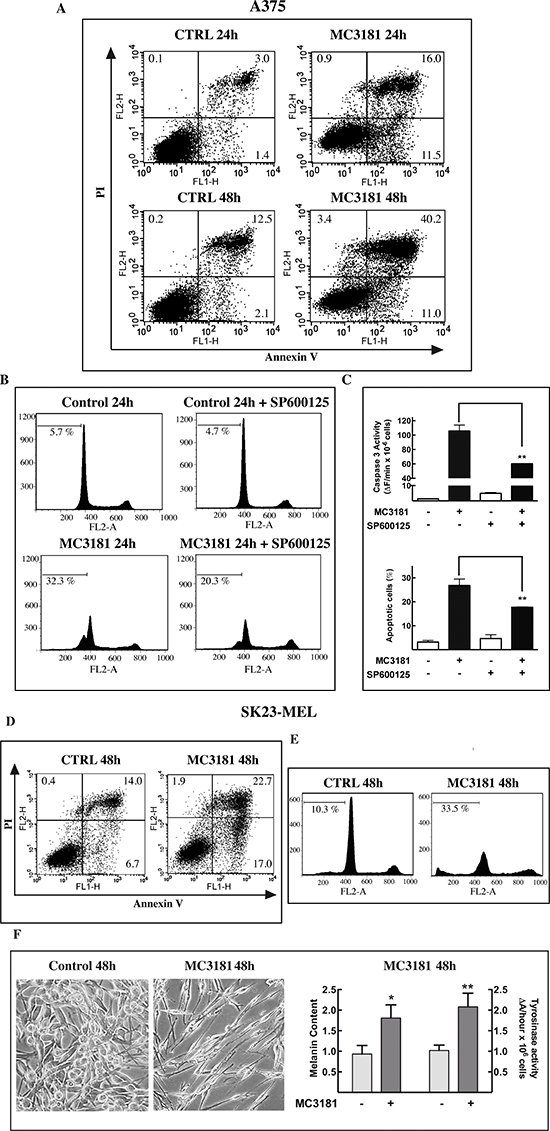 In a separate set of experiments, the A375 cell line was exposed to the JNK inhibitor SP600125 (20 μM), which was added 1 h before the addition of MC3181.