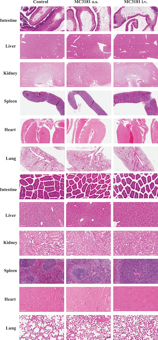 Multiple-dose toxicology studies were carried out in seven-week-old female CD-1 mice (Charles River, Calco, Italy). Animals were randomly assigned to each experimental group (n = 3/group) and were treated orally or intravenously with MC3181 (8 mg/kg dissolved in PBS), or PBS only (control group) for 5 consecutive days (q1dx5) followed by a 2-day wash-out. After 3 weeks of treatment, mice were sacrificed and organs collected for tissue injury assessment by H&E staining. Briefly, organs (intestine, liver, kidneys, spleen, heart, and lungs) were formalin-fixed (PFA 1%, Thermo Scientific, Milan, Italy) for 2 hrs and then transferred in PBS 20% sucrose (Sigma, Milan, Italy) for the H&E staining.