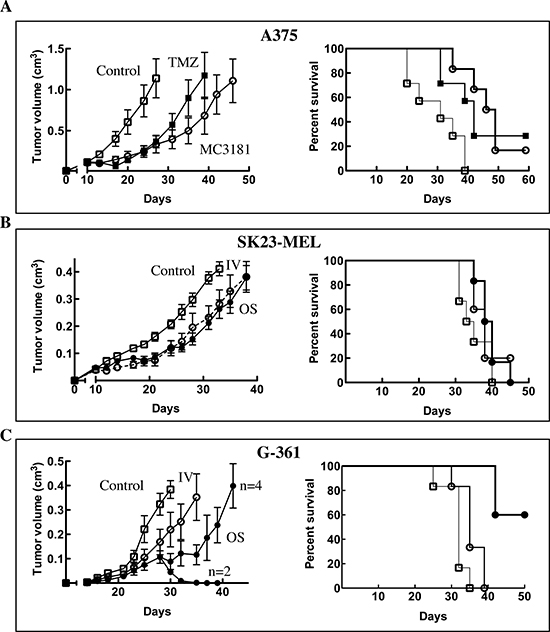 SK23-MEL and G-361 cells were injected s.c. (in both cases, 1x106) into the right flank of NOD/SCID and SCID male mice, respectively. Animals were randomly divided in groups of 6 mice and treatments were started at day 10 (SK23-MEL) and 14 (G-361), when tumors were clearly palpable.