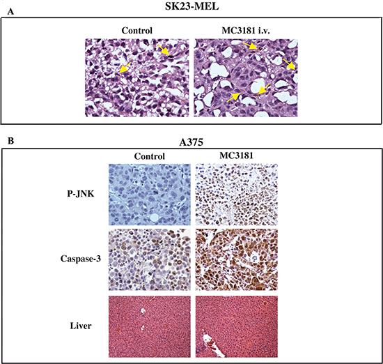 Tissue-xenografts treated with 8 mg/kg of MC3181 were studied by immonohistochemistry to identify the activation of JNK (after 6 hrs) and apoptosis, characterized by immune-staining for Caspase3 (at the end of treatment). Briefly, 3-μm-thick sections were pre-treated with EDTA citrate pH 7.8, for 30 min, at 95°C and then incubated respectively with rabbit monoclonal anti-Phospho-SAPK/JNK (1:100, 81E11, Cell Signaling, Danvers Massachusetts, USA) and rabbit polyclonal anti-Caspase3, for 60 min (1:100, PA5-16335, ThermoFisher Scientific, Walthman, MA, USA). Washing were performed with PBS 4% + Tween20, pH 7.6, by UCS diagnostic. Reactions were revealed by HRP – DAB Detection Kit (UCS diagnostic).