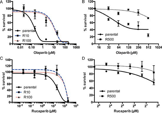 We used UWB1.289 ovarian cancer cells and HCC1937 breast cancer cells as parental cell lines to generate PARP inhibitor-resistant lines. Both the cell lines harbor homozygous mutation of BRCA1. PARP inhibitor-resistant clones (R10 and R100 in UWB1.289 and R500 in HCC1937) were developed independently by repeated exposure to different doses of PARP inhibitor (Olaparib AZD2281, KU-0059436) (10nM, 100nM and 500nM, respectively). To generate PARP inhibitor-resistant lines, we have used olaparib (AstraZeneca), a PARP inhibitor that is most advanced in clinical development, and currently in phase III testing [1–4]. For checking resistance to PARP inhibition, we used 2 distinct compounds-olaparib and rucaparib (AG014699); Clovis). While olaparib showed promising results in phase II studies in patients with breast and ovarian cancers having BRCA mutations [4], rucaparib was initially established as a radiosensitizer and to potentiate the effect of temozolamide. Phase II/III trials are currently underway for both these agents with preliminary results of activity in BRCA mutant cancers [14]. Both the olaparib and rucaparib are bona fide PARP inhibitors and inhibit both PARP1 and PARP2 [14]. Both of the compounds have similar potency in inhibiting PARP catalytic activity [14–16]. The PARP inhibitor-resistant lines show decreased sensitivity to both olaparib and rucaparib, both in UWB1.289 setting-R10/R100 (Figure 1A and 1B) and in the HCC1937 setting-R500 (Figure 1C and 1D).