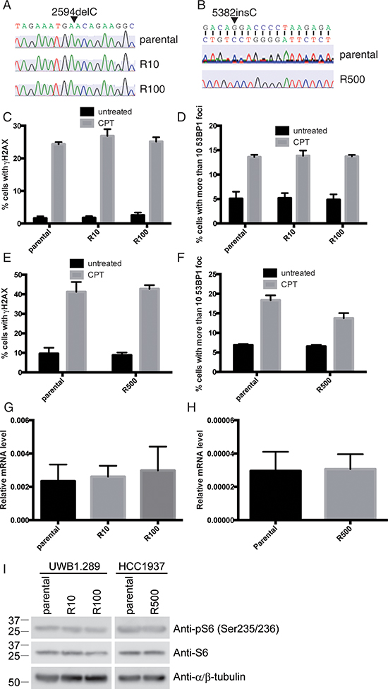 Figure 2: Known mechanisms for PARP inhibitor-resistance are not applicable. Direct sequencing of BRCA1 gene in UWB1.289 (A) and HCC1937 (B) are shown. Cells were treated with CPT (camptothecin: 3μM) for 3 hours and stained with antibodies against γH2AX and 53BP1. Untreated cells were also stained as control. Histogram shows ratio of γH2AX positive cells in UWB1.289 (C) and in HCC1937 (E) and ratio of cells with more than 10 53BP1 foci in UWB1.289 (D) and in HCC1937 (F). Error bar shows standard deviation of three independent experiments. Histogram shows mRNA expression of Abcb1a in parental and PARP inhibitor-resistant UWB1.289 (G) or HCC1937 (H). Error bar shows standard deviation of three independent experiments. Cell lysates from parental or PARP inhibitor-resistant UWB1.289 or HCC1937 cells were subjected for western blotting with indicated antibodies (I).