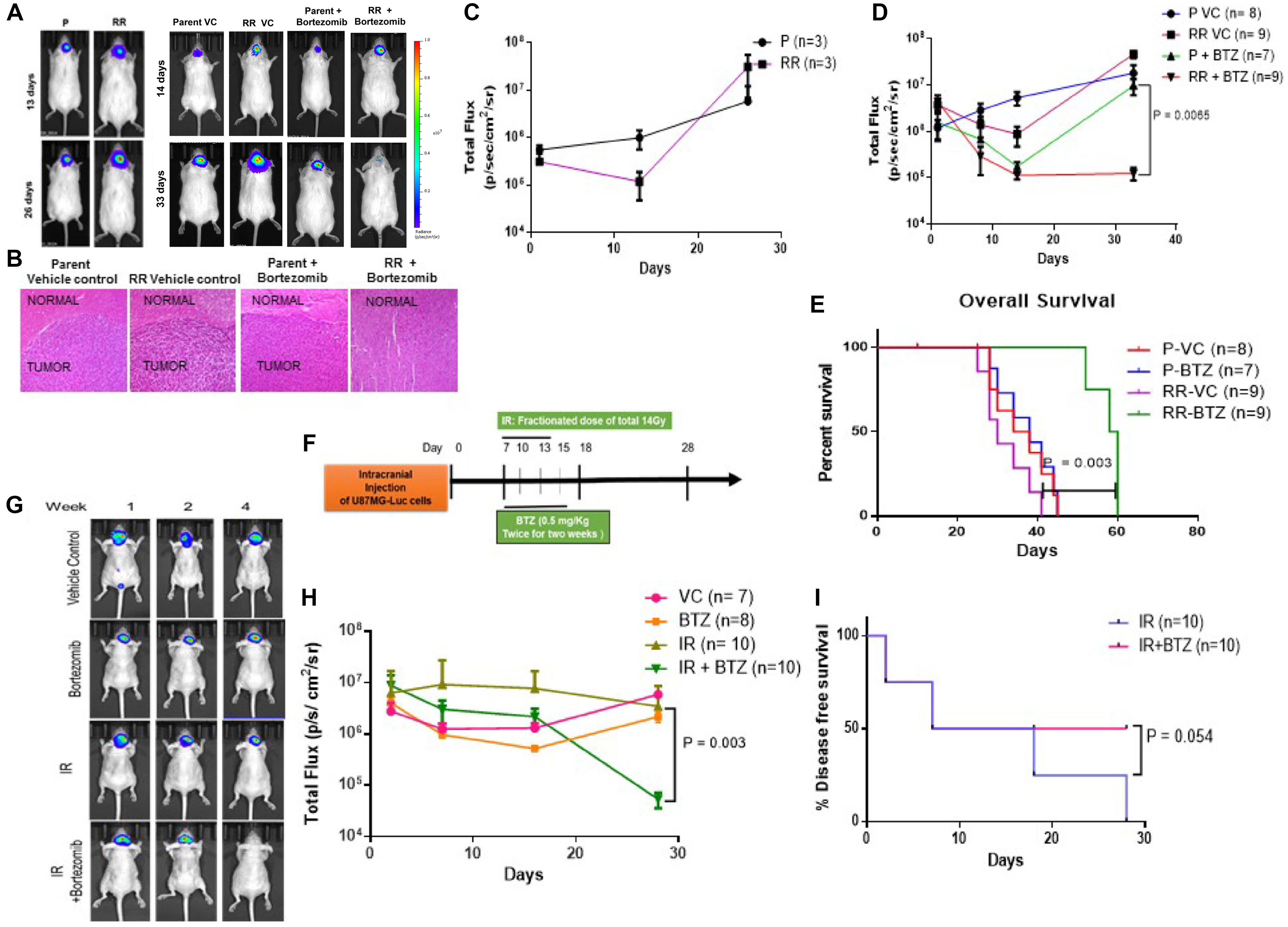 Figure 6: Proteasome inhibition reduces the tumorigenic potential of the cells in vivo. (A) Left panel - Representative bioluminescence images after orthotopic injection of U87MG-Luciferase labelled Parent (P) and Radiation Resistant (RR) cells. Right Panel - Bioluminescent images after orthotopic injection of U87MG-Luciferase labelled Parent (P) and Radiation Resistant (RR) cells treated with Vehicle Control (VC) and Bortezomib. (B) Hematoxylin and eosin (H&E) staining of mice brain slices. Brain slices of the brain tissue from mice injected with Parent Vehicle control, RR Vehicle Control, Parent + Bortezomib, RR + Bortezomib cells were formalin fixed and paraffin embedded. Sections stained with H&E show regions infiltrated with tumour cells. All photomicrographs are shown with the same magnification. Bar = 100 μm. (C) Graph represents bioluminescence signal at different days post injection in mice injected with P and RR cells. (D) Graph represents bioluminescence intensity at different days post injection of mice injected with P and RR cells pretreated with bortezomib as compared to P and RR cells treated with vehicle control. ‘n’ represents number of mice per group. (E) Kaplein Meier Curve for the overall survival of the mice in the pretreated study. (F) Schematic representation for studying the effect of intraperitoneal injections of bortezomib along with radiation treatment of mice intracranially injected with parent GBM cells. IR–Radiation; BTZ–Bortezomib. (G) Representative bioluminescence images of tumor formation in the mice treated with IR and BTZ compared to the mice which were administered with Vehicle Control (VC), only BTZ and only IR. (H) Graphical representation of bioluminescence intensity recorded for mice treated with IR and BTZ compared to the mice which were administered only saline as Vehicle Control (VC), only BTZ, only IR. (I) Kaplein Meier Curve for % tumor free animals in the radiation and intraperitoneally administered BTZ study.