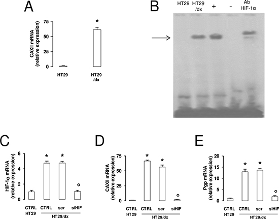 Figure 3: CAXII and Pgp expression levels are affected by HIF-1α in chemoresistant cells. (A) The CAXII mRNA level in HT29 and HT29/dx cells was detected by qRT-PCR. Data are presented as means ± SD (n = 4). Versus HT29: *p < 0.001. (B) EMSA detection of HIF-1α bound to its DNA consensus sequence was performed on nuclear extracts of normoxic HT29 and HT29/dx cells. Hypoxic HT29 cells (grown at 2% O2 for 24 h) were used as positive control of HIF-1α activation (+). One lane was loaded with distilled water in place of cell extracts and was used as negative control (−). As control of specificity, the nuclear extracts of hypoxic HT29 cells were incubated with an anti-HIF-1α antibody (Ab HIF-1α). The band corresponding to the HIF-1α-DNA complex is indicated by the arrow. The figure is representative of three experiments with similar results. (C–E) mRNA was extracted from wild-type HT29 cells and HT29/dx cells (CTRL), HT29/dx cells treated with a non targeting scrambled siRNA (scr) or with a HIF-1α-targeting specific siRNA pool (siHIF) for 24 h. The expression of HIF-1α (panel C), CAXII (panel D) and Pgp (panel E) was detected by qRT-PCR. Data are presented as means ± SD (n = 4). Versus CTRL HT29: *p < 0.001; versus CTRL HT29/dx: ° p < 0.001.