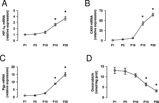 Figure 4: CAXII increases during the acquisition of chemoresistance. HT29 cells were cultured in medium containing increasing concentrations of doxorubicin, as detailed under Methods. (A–C) At passage (P) 1, 5, 10, 15, 20 the mRNA was extracted and the expression of HIF-1α (panel A), CAXII (panel B) and Pgp (panel C) was detected by qRT-PCR. Data are presented as means ± SD (n = 4). Versus P1: *p < 0.001. (D) An aliquot of cells was incubated 24 h with 5 μmol/L doxorubicin, then lysed and analyzed for the intracellular doxorubicin content. Data are presented as means ± SD (n = 4). Versus P1: *p < 0.001.