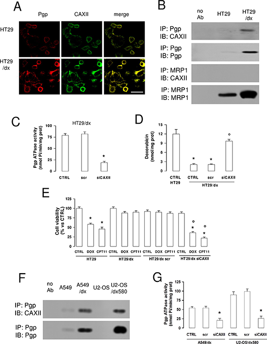 Figure 6: CAXII is physically associated with Pgp and increases Pgp activity in chemoresistant cells. (A) Confocal microscope analysis of HT29 and HT29/dx cells stained for CAXII and Pgp. The samples were analyzed by laser scanning confocal microscope for green (CAXII) or red (Pgp) fluorescence signal. Magnification: 60 × objective; 10 × ocular lens. Bar = 20 μm. (B) Biotinylated plasma membrane-derived extracts from HT29 and HT29/dx cells were immunoprecipitated (IP) with anti-Pgp or anti-MRP1 antibodies, then immunoblotted (IB) with anti-CAXII, anti-Pgp or anti-MRP1 antibodies. no Ab: samples immunoprecipitated without antibody. The figure is representative of three experiments with similar results. (C) HT29/dx cells were cultured for 48 h with fresh medium (CTRL), treated with a non targeting scrambled siRNA (scr) or with a CAXII-targeting specific siRNA pool (siCAXII). The Pgp ATPase activity was measured spectrophotometrically on Pgp-rich vesicles extracted from membrane fractions. Data are presented as means ± SD (n = 4). Versus CTRL: *p < 0.001. (D) Cells treated as reported in C were incubated for 24 h with 5 μmol/L doxorubicin, then the intracellular drug content was measured fluorimetrically. HT29 were included as control of chemosensitive cells. Data are presented as means ± SD (n = 4). Versus HT29 CTRL: *p < 0.001; versus HT29/dx CTRL: ° p < 0.001. (E) Cells treated as reported in C were grown for 72 h in fresh medium (CTRL), or in medium containing 5 μmol/L doxorubicin (DOX) or 1 μM irinotecan (CPT11), then stained with neutral red dye. The absorbance of viable cells was measured spectrophotometrically. Data are presented as means ± SD (n = 4). For HT29 and HT29/dx cells, versus CTRL: *p < 0.001; for HT29/dx cells, versus wild type HT29/dx DOX or HT29/dx CPT11, respectively: ° p < 0.002. (F) Biotinylated plasma membrane-derived extracts from human chemosensitive lung cancer A549 cell and chemoresistant A549/dx cells, human chemosensitive osteosarcoma U2-OS cells and chemoresistant U2-OS/dx580 cells were immunoprecipitated (IP) with an anti-Pgp antibody, then immunoblotted (IB) with an anti-CAXII or an anti-Pgp antibody. no Ab: samples immunoprecipitated without antibody. The figure is representative of two experiments with similar results. (G) A549/dx and U2-OS/dx580 cells were grown in fresh medium (CTRL), treated with a non targeting scrambled siRNA (scr) or with a CAXII-targeting specific siRNA pool (siCAXII). The Pgp ATPase activity was measured spectrophotometrically on Pgp-rich vesicles extracted from membrane fractions. Data are presented as means ± SD (n = 3). For both cell lines, versus CTRL: *p < 0.001.