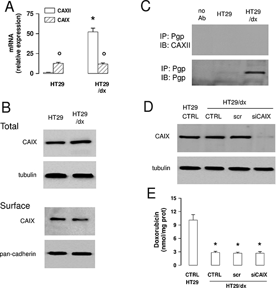 Figure 7: CAIX does not mediate chemoresistance to Pgp substrates in colon cancer cells. (A) The CAIX mRNA level in HT29 and HT29/dx cells was detected by qRT-PCR. CAXII mRNA level is shown for comparison. Data are presented as means ± SD (n = 4). Versus HT29: *p < 0.001; for both HT29 and HT29/dx cells, CAIX versus CAXII expression: ° p < 0.001. (B) Western blot analysis of CAIX expression in whole cell lysates (upper panel; Total) and biotinylated plasma membrane-derived extracts (lower panel; Surface) in HT29 and HT29/dx cells. The β-tubulin and pan-cadherin expression were used as controls of equal protein loading in whole cell lysates and plasma membrane-derived extracts, respectively. The figure is representative of three experiments with similar results. (C) Biotinylated plasma membrane-derived extracts from HT29 and HT29/dx cells were immunoprecipitated (IP) with an anti-Pgp antibody, then immunoblotted (IB) with an anti-CAIX or an anti-Pgp antibody. no Ab: samples immunoprecipitated without antibody. The figure is representative of three experiments with similar results. (D) HT29/dx cells were cultured for 48 h with fresh medium (CTRL), treated with a non targeting scrambled siRNA (scr) or with a CAIX-targeting specific siRNA pool (siCAIX). HT29 cells were included as control. The expression of CAIX was measured in whole cell lysates by Western blotting. The β-tubulin expression was used as a control of equal protein loading. The figure is representative of three experiments with similar results. (E) HT29/dx cells treated as reported in D were incubated for 24 h with 5 μmol/L doxorubicin, then the intracellular drug content was measured fluorimetrically. HT29 cells were included as control of chemosensitive cells. Data are presented as means ± SD (n = 4). Versus HT29 CTRL: *p < 0.001.