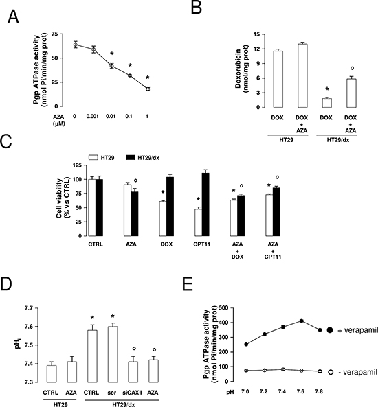 Figure 8: Effects of acetazolamide on Pgp activity, chemosensitivity and intracellular pH in chemoresistant cancer cells. (A) Pgp-rich vesicles were extracted from membrane fractions of HT29/dx cells, then the Pgp ATPase activity was measured spectrophotometrically in the absence (0) or in the presence of increasing concentrations of acetazolamide (AZA), added during the assay. Data are presented as means ± SD (n = 4). Versus 0: *p < 0.005. (B) HT29 and HT29/dx were incubated for 24 h with 5 μmol/L doxorubicin (DOX). When indicated, 1 μmol/L acetazolamide (AZA) was co-incubated. The intracellular doxorubicin retention was measured fluorimetrically. Data are presented as means ± SD (n = 4). HT29/dx DOX cells versus HT29 DOX cells: *p < 0.001; HT29/dx DOX+AZA cells versus HT29/dx DOX cells: ° p < 0.005. (C) Cells were grown for 72 h in fresh medium (CTRL), or in medium containing 1 μM acetazolamide (AZA), 5 μmol/L doxorubicin (DOX), 1 μM irinotecan (CPT11), alone or in combination, then stained with neutral red dye. The absorbance of viable cells was measured spectrophotometrically. Data are presented as means ± SD (n = 4). For HT29 cells, versus CTRL: *p < 0.001; for HT29/dx cells, versus CTRL: ° p < 0.05. (D) The intracellular pH (pHi) measurement was performed in duplicate (n = 4) on HT29 and HT29/dx cells untreated or treated with a non targeting scrambled siRNA (scr), with a CAXII-targeting specific siRNA pool (siCAXII) for 48 h, with 1 μmol/L acetazolamide (AZA) for 24 h. Significance versus HT29 cells: *p < 0.01; versus HT29/dx cells: ° p < 0.02. (E) The Pgp ATPase activity was measured spectrophotometrically in Pgp-rich vesicles extracted from HT29/dx cell membrane fractions, using buffers with different pH, in the absence (open circles) or presence (solid circles) of 10 μmol/L verapamil, chosen as a Pgp activator. Data are presented as means ± SD (n = 4).