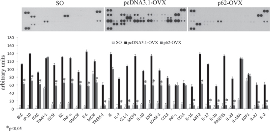 Figure 2: p62 DNA pretreatment decreases pro-inflammatory cytokines and chemokines release in OVX mice. Cytokines and chemokines release was analyzed in medium from bone marrow cultures obtained by sham operated, p62 or pcDNA 3.1 pre-treated OVX mice. (*p < 0.05).