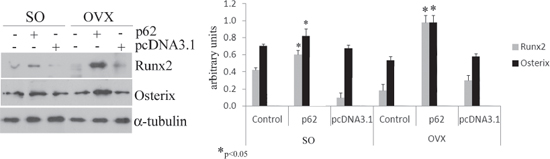 Figure 3: p62 DNA increases osteogenic markers. Total bone marrow cell populations were obtained from long bones of sham operated, pcDNA3.1-OVX and p62 DNA-OVX mice and were examined by Western blotting for Runx2 and osterix expression. (*p < 0.05).