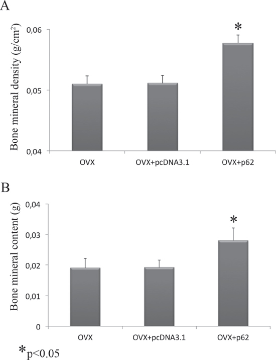 Figure 5: BMD and BMC evaluation after p62 treatment. Bone mineral density (A) and bone mineral content (B) were increased in OVX mice treated with p62-encoding plasmid. (*p < 0.05).