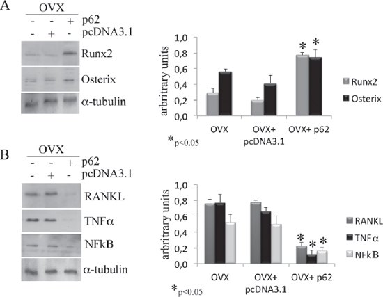 Figure 6: p62 vaccine decreases pro-inflammatory markers. Total bone marrow cell population was obtained from long bones of OVX, OVX-pcDNA3.1 and OVX-p62 DNA. Note the statistically significant increase of Runx2 and osterix (A) as well as the decrease of RANKL, TNFα and NFkB (B) protein levels only after p62 treatment. (*p < 0.05).