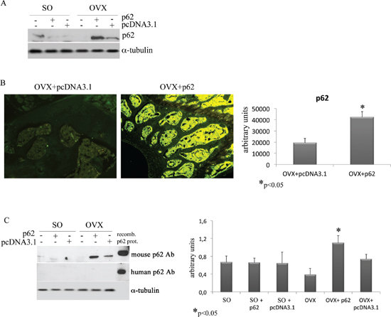 Figure 7: p62 encoding plasmid up-regulates the endogenous p62 protein synthesis. p62 protein levels were detected in total bone marrow population (A) and in the epiphyseal areas of femur sections (B) by Western blotting and immunofluorescence, respectively. Note the increase of p62 synthesis in samples from p62-OVX mice. Evaluation of p62 levels in BMCs by a specific mouse/human antibody or by a specific human antibody. Note the lack of human p62 detection, and the increase of mouse p62 protein in BMCs from p62-OVX mice (C) (*p < 0.05).