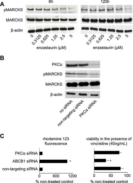 Figure 2: Investigation of PKC signalling. (A) Enzastaurin inhibits PKC activity in concentrations ≥ 1.25 μM in UKF-NB-3rVCR10 cells after enzastaurin treatment for 6 h and in a concentration of 5 μM after 120 h. Western blots indicate protein levels of the PKC target MARCKS, its phosphorylated form (pMARCKS), and β-actin (loading control). Effects on ABCB1 function were observed at an enzastaurin concentration of 0.3125 μM (Figure 1D, Suppl. Table 3). (B) Effects of siRNA-mediated PKCα depletion on MARCKS phosphorylation determined in UKF-NB-3rVCR10 cells 48 h after transfection; (C) siRNA directed against ABCB1 (but not siRNA directed against PKCα) increases (1) accumulation of the fluorescent ABCB1 substrate rhodamine 123 (0.5 μM) in ABCB1-expressing UKF-NB-3rVCR10 cells and (2) the sensitivity of UKF-NB-3rVCR10 cells to the cytotoxic ABCB1 substrate vincristine. Effects of siRNAs on ABCB1 expression are presented in Suppl. Figure 1. (*P < 0.05) relative to non-targeting siRNA.