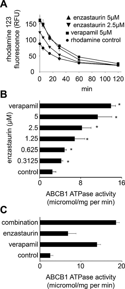 Figure 3: Direct interaction of enzastaurin with ABCB1. (A) Time kinetics of rhodamine 123 (0.5 μM) fluorescence in UKF-NB-3rVCR10 cells after incubation for 60 min with rhodamine 123 alone (rhodamine control), enzastaurin 5 μM or 2.5 μM plus rhodamine 123, or verapamil 5 μM (known ABCB1 substrate serving as control) plus rhodamine 123 after wash-out as detected by flow cytometry (RFU = relative fluorescence units). *P < 0.05 relative to rhodamine alone; (B) ABCB1 ATPase activity in isolated membranes in the presence of verapamil 5 μM or enzastaurin. *P < 0.05 relative to non-treated control; (C) ABCB1 ATPase activity in non-treated isolated membranes or in the presence of verapamil 5 μM, enzastaurin 1.25 μM, or the combination of verapamil 5 μM and enzastaurin 1.25 μM. *P < 0.05 relative to single treatment with verapamil and enzastaurin.