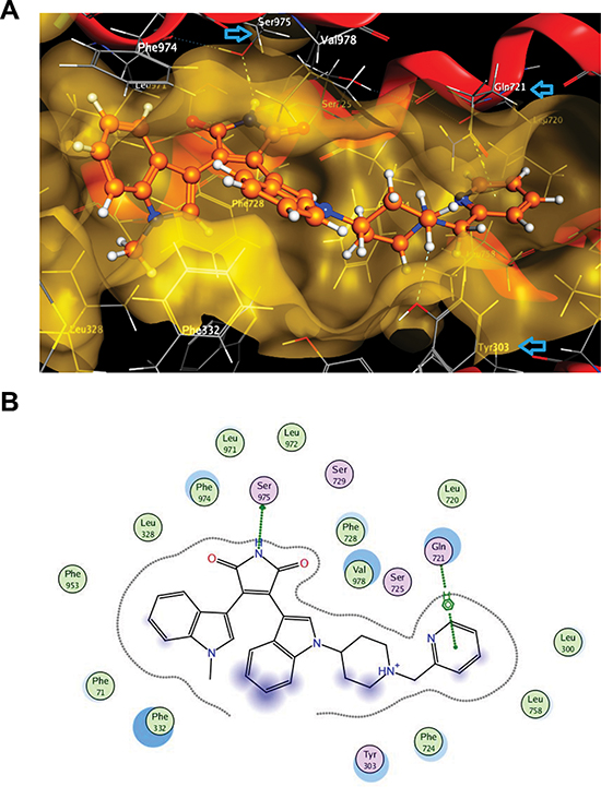 Figure 4: Interaction of enzastaurin with ABCB1 as indicated by docking experiments. (A) 3D view of a portion of the active site of mouse abc1b1 (3G60) at the lowest docking energy with docked enzastaurin in the binding pocket; blue arrows in this pose indicate residues (Ser925, Tyr303 and Gln721) that have strong interactions with enzastaurin (limited within 4.5 Å); (B) 2D ligand interaction diagram for enzastaurin with mouse Abcb1a using default settings of MOE software. The polar and non-polar residues are indicated by pink or green coloured amino acids respectively. Hydrogen bonding is indicated by green dotted arrow, while arene-H interaction is shown by green dotted line. The proximity contour is the dotted line surrounding the ligand. Blue shadows in of the residues indicate the receptor exposure differences by the size and intensity of the quoits discs. The directions of the shadow indicate the directions of the amino acids towards the ligands. The blue clouds around the ligand atoms indicate that are exposed to the solvent.