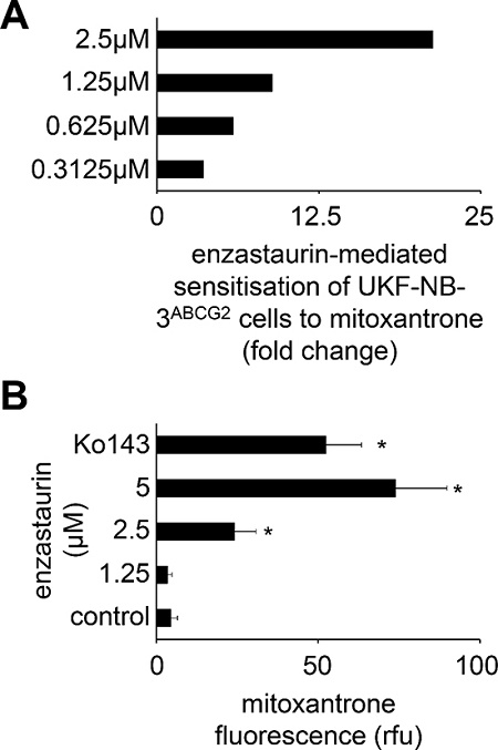 Figure 5: Influence of enzastaurin on ABCG2 function. (A) Sensitisation of UKF-NB-3 cells transduced with a lentiviral vector encoding for ABCG2 (UKF-NB-3ABCG2) to the ABCG2 substrate mitoxantrone by enzastaurin concentrations that did not influence UKF-NB-3ABCG2 cell viability (fold change IC50 mitoxantrone/ IC50 mitoxantrone in the presence of enzastaurin), numerical data are presented in Suppl. Table 6; (B) Influence of enzastaurin on accumulation of mitoxantrone (40 μM; a fluorescent ABCG2 substrate) in UKF-NB-3ABCG2 cells as detected by flow cytometry (RFU = relative fluorescence units). The ABCG2 inhibitor Ko143 (1 μM) served as positive control. *P < 0.05 relative to mitoxantrone alone.