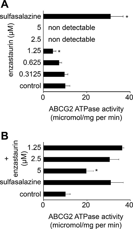 Figure 6: Effects of enzastaurin on the ABCG2 ATPase. (A) ABCG2 ATPase activity in isolated membranes in the presence of enzastaurin or the ABCG2 substrate sulfasalazine 10 μM. *P < 0.05 relative to non-treated control; (B) ABCG2 ATPase activity in non-treated isolated membranes or in the presence of sulfasalazine 10 μM alone or in combination with enzastaurin. *P < 0.05 relative to single treatment with sulfasalazine.