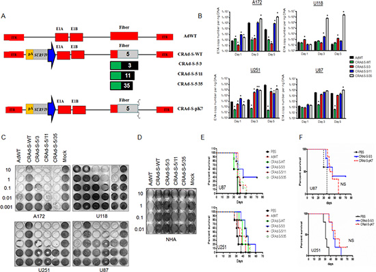 Figure 2: In vitro and in vivo transductional activity of oncolytic vectors using glioma cells. Replication (B) and in vitro cytotoxic activity (C and D) of designed oncolytic vectors pseudotyped with adenoviral type B fibers. Analysis of CRAds (A) replication in cancer cells was conducted at the samples 1, 3 and 5 days after infection (B) At selective time point total DNA was isolated in according to the Material and Methods and amount of viral E1A copies was measured using real time PCR and presented as mean+/-SD. Cytotoxicity mediated by CRAd vectors at the glioma cells (C) and culture of adults non-malignant astrocytes (D);* p < 0.05 vs CRAd-S-5/3, ** p < 0.05 vs CRAd-S-WT; In vivo cytopathic effect mediated by oncolytic vectors pseudotyped with fibers of adenoviruses belong to group B. (E) Therapeutic survival of mice in the presence of oncolytic vectors was measured using Kaplan-Meier survival plot. Mice received intracranial injection of U87 or U251 cells and 7 days later additional injection of one of the competent vector of AdWT, CRAd-S-WT, CRAd-S-5/3, CRAd-S-5/11, CRAd-S-5/35 or CRAd-S-pK7 vectors (100 IU/cell) were monitored twice per week over span of 50 days; (F) Efficacy of glioma inhibition mediated CRAd-S-pK7 and CRAd-S-5/3 vectors in vivo, p > 0.05.