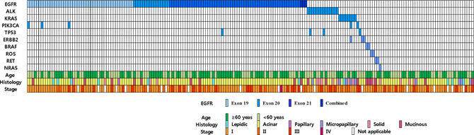 Figure 3: Diagram demonstrating driver gene mutation status and clinicopathologic features in 198 adenocarcinomas from East Asian never-smoker females. Most mutations were mutually exclusive with the rare exception of concurrent mutation of EGFR/PIK3CA (n = 3), EGFR/TP53 (n = 1), ALK/TP53 (n = 2), KRAS/PIK3CA (n = 1), and KRAS/ERBB2 (n = 1). Patients who received concurrent chemoradiation therapy and those who did not undergo lymph node dissection were excluded in the analysis of TNM stage.