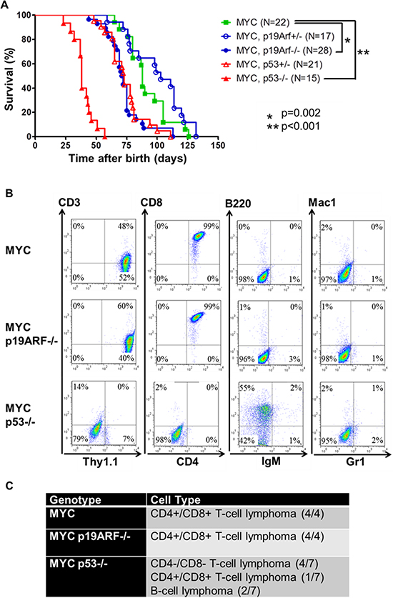 Figure 1: Loss of p19ARF or p53 cooperates with MYC. (A) Survival plot showing that loss of both alleles of p19ARF or loss of one or two alleles of p53 accelerates lymphomagenesis. MYC mice develop lymphoma in 89 days (n = 22), while MYC p19ARF+/− mice in 100 days (n = 17, p = 0.1), MYC p19ARF−/− mice in 73 days (n = 28, p = 0.002), MYC p53−/− mice in 40 days (n = 15, p = 0.001), MYC p53+/− mice in 74 days (n = 21, 0.004). (B) Flow cytometry analysis of cell surface markers of lymphomas from MYC, MYC p19ARF−/−, MYC p53−/−. The cells were analyzed by FACS for Thy1.1, CD2, CD4, CD8, B220, IgM, Gr1 and Mac1. (C) Lymphomas in MYC (n = 4) and MYC p19ARF−/− mice (n = 4) were CD4+/CD8+ T-cell lymphoma, while those in MYC p53−/− mice (n = 7) were CD4+/CD8+ T-cell lymphoma (14%), CD4-/CD8- T-cell lymphoma (56%) or B-cell lymphoma (28%).