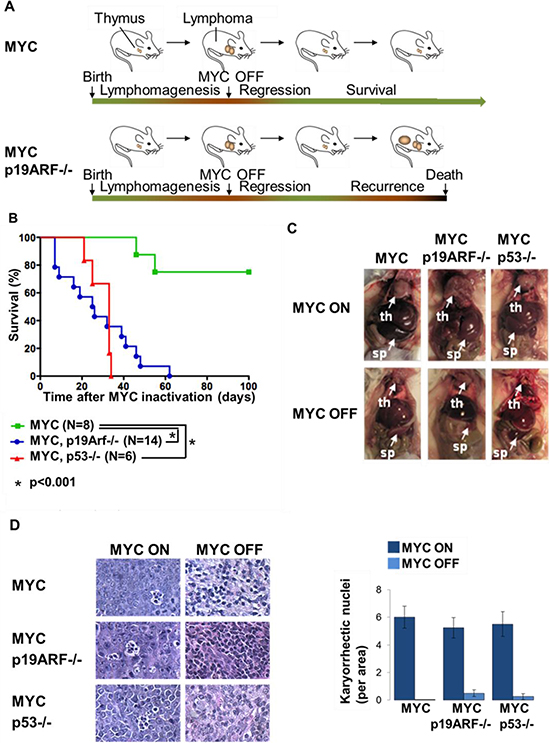 Figure 2: Loss of p19ARF or p53 facilitates lymphoma recurrence. (A) Schematic showing the experimental design. MYC and MYC p19ARF−/− mice develop lymphomas when MYC is expressed from the time of conception. MYC is turned off when the mice develop lymphoma. The mice are monitored for lymphoma recurrence following the initial lymphoma regression. (B) Survival curve showing the percentage of mice versus time from MYC inactivation to death. Only 25% of MYC mice (n = 8) had spontaneous recurrence of lymphoma, while 100% of the MYC p19ARF+/− (n = 14), MYC p19ARF−/− (n = 14), MYC p53+/− (n = 14) and MYC p53−/− (n = 6) mice had recurrence. The survival time after MYC inactivation was 27 days in MYC p19ARF−/− mice, which was shorter than the survival time in MYC p19ARF+/− mice (35 days, p = 0.094) and MYC p53+/− mice (49 days, p = 0.014), but was not different from the survival time in MYC p53−/− mice (30 days, p = 0.6). (C) MYC, MYC p19ARF−/− and MYC p53−/− mice show similar pathology with enlarged thymus and spleen due to lymphoma. Upon 5 days of MYC inactivation, thymus and spleen shrink. (D) Hematoxylin-eosin staining shows that lymphoma in the thymuses of MYC, MYC p19ARF−/− and MYC p53−/− mice show similar histology at the microscopic level. The lymphoma sections include many apoptotic cells with fragmented nuclei. Upon 5 days of MYC inactivation, we note decrease in apoptotic cells.