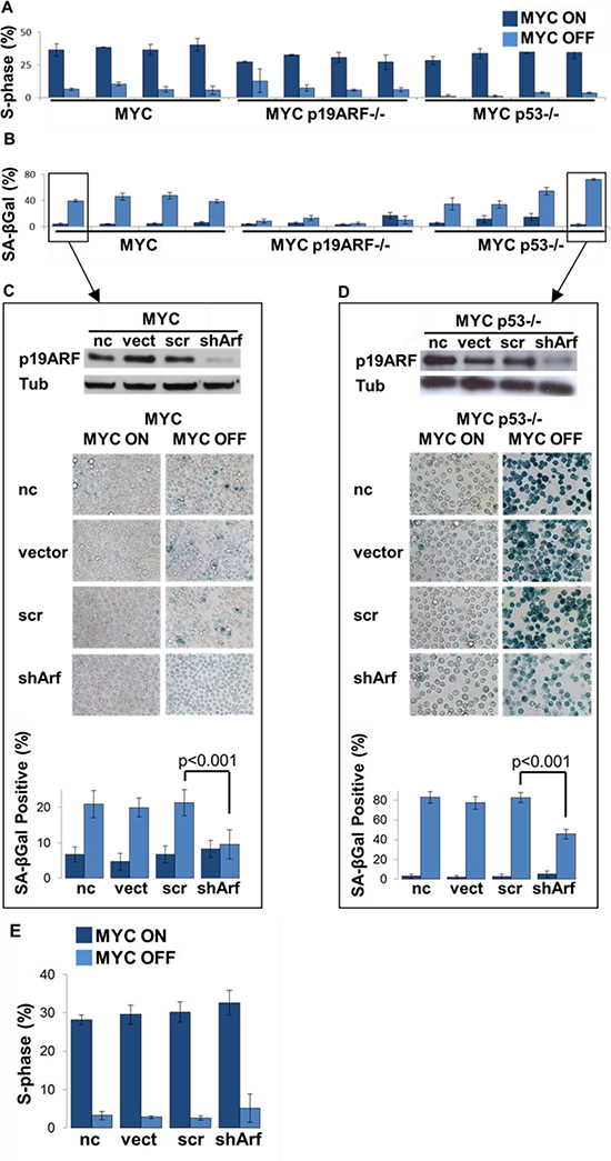 Figure 3: Loss of p19ARF prevents MYC inactivation induced senescence in a p53-independent manner. (A) MYC inactivation induces proliferative arrest in MYC, MYC p19ARF−/− and MYC p53−/− lymphoma cells. Graph shows that after 2 days of MYC inactivation in vitro, S-phase fraction measured by flow cytometry on PI-stained cells drops to 7%, 8% and 3% in MYC, MYC p19ARF−/− and MYC p53−/− cells, respectively. (B) MYC inactivation induces increased SA-beta-galactosidase activity in MYC and MYC p53−/− lymphoma cells, but not in MYC p19ARF−/− cells. Graph shows that upon MYC inactivation percentage of cells that are SA-beta-galactosidase positive increased in MYC MYC p53−/− cells. SA-beta-galactosidase positivity was much lower in MYC p19ARF−/− cells and was unchanged before or after MYC inactivation. (C) Western blot showing knockdown of p19ARF expression by shRNA in a MYC p53−/− lymphoma cell line. Alpha-tubulin serves as loading control. shRNA targets exon1β of CDKN2A, hence it is specific to p19ARF. (D) Knockdown of p19ARF even in the absence of p53 curbs the increase in SA-beta-galactosidase activity when MYC is turned off. One MYC p53−/− cell line was transfected with an empty vector, a vector expressing control shRNA or p19ARF shRNA. Cells were stained with SA-beta-galactosidase assay in MYC on condition or 2 days after MYC inactivation. Graph showing percentage of cells that are positive for SA-beta-galactosidase activity. After 2 days of MYC inactivation, p19ARF knockdown cells (shArf) had significantly lower percentage of SA-beta-galactosidase positive cells as compared to uninfected (p = 0.001), empty vector (p = 0.001) and control shRNA cells (p = 0.001). (E) PI staining of S-phase cell cycle data, revealing that MYC p53−/− tumors do not demonstrate cell cycle arrest upon knockdown of p19ARF with shRNA.