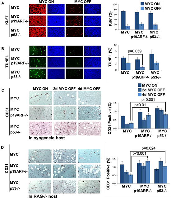 Figure 4: Shutdown of angiogenesis, but not proliferative arrest, upon MYC inactivation in vivo is diminished by the loss of p19ARF or p53. (A) Proliferation analysis by Ki67 immunofluorescence on sections of primary lymphoma. Graph shows Ki67 positive area as normalized to DAPI. Upon 5 days of MYC inactivation, Ki67 positive cells decreased from 74%, 69%, 66% to 14%, 22%, 20% in MYC, MYC p19ARF−/− and MYC p53−/− lymphoma, respectively. There was no significant difference between MYC p19ARF−/− and MYC (MYC off, p = 0.4) or MYC p53−/− and MYC lymphomas (MYC off, p = 0.5). MYC inactivation leads to a decrease in proliferation in MYC, MYC p19ARF−/− and MYC p53−/− lymphomas. (B) Apoptosis analysis by TUNEL staining on sections of primary lymphoma. MYC inactivation leads to a decrease in apoptosis in MYC, MYC p19ARF−/− and MYC p53−/− lymphomas. Graph shows TUNEL positive area as normalized to DAPI. Upon 5 days of MYC inactivation, TUNEL positive cells decreased in MYC, MYC p19ARF−/− and MYC p53−/− lymphoma. There was no significant difference between MYC p53−/− and MYC lymphomas (MYC off, p = 0.9) or between MYC p19ARF−/− and MYC lymphomas (MYC off, p = 0.059). (C) Tumor vessel density assessed by CD31 immunohistochemistry on transplanted lymphoma cell lines in syngeneic hosts before and during MYC inactivation time course. Graph shows percentage of CD31 positively stained area. MYC tumors exhibit dramatically reduced CD31 staining upon MYC inactivation. MYC p19ARF−/− and MYC p53−/− tumors show elevated CD31 staining compared to MYC tumors both before and after MYC inactivation. (D) Tumor vessel density assessed by CD31 immunohistochemistry on transplanted lymphoma cell lines in immunodeficient RAG−/− hosts.