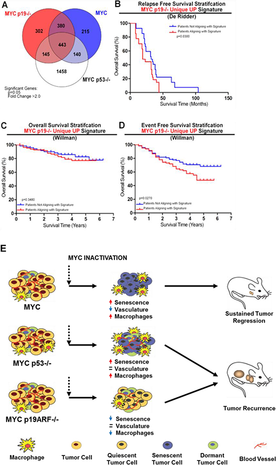 Figure 7: Microarray signature associated with loss of p19ARF predicts poor event free survival in B- and T-ALL patients and model showing the mode of recurrence of MYC p19ARF−/− and MYC p53−/− lymphomas. (A) Venn diagram shows common and unique genes that are upregulated by MYC in MYC, MYC p19ARF−/− and MYC p53−/− mouse lymphomas. Genes that have a MYC on/MYC off expression ratio of +/− 2-fold in MYC, MYC p19ARF−/− and MYC p53−/− mouse lymphomas are shown. MYC p19ARF−/− unique gene signature was identified. (B) Human B- and T-ALL patients from the cohort collected by the de Ridder laboratory (GSE18497) for the Diagnosis of ALL Relapse study were divided into two groups by k-means clustering according to their expression of the genes within the MYC p19−/− unique gene signature. The two groups were then stratified via Kaplan-Meier survival analysis for relapse free survival, revealing that patients overexpressing the MYC p19−/− unique gene signature display a significantly lower relapse free survival than those that showed lower expression of the signature genes. (C) Human B- and T-ALL patients from the cohort collected by the Willman laboratory (GSE11877) for the Children's Oncology Group Study 9906 for High-Risk Pediatric ALL were divided into two groups by k-means clustering similar to the first data set and then stratified via Kaplan-Meier survival analysis for overall survival, revealing that there was no significant difference between the two patient groups based on overall survival. (D) The two groups were then stratified via Kaplan-Meier survival analysis for event free survival based on the same k-means clustering for C. This analysis revealed that patients overexpressing the MYC p19−/− unique gene signature showed a significantly lower event free survival (shorter time to relapse) than those that showed lower expression of the signature genes. (E) Model showing MYC, MYC p19ARF−/− and MYC p53−/− lymphomas respond to MYC inactivation differently. MYC lymphomas undergo sustained regression and remain in remission due to senescence of lymphoma cells and decrease in microvessel density. MYC p19ARF−/− and MYC p53−/− lymphomas both fail to undergo sustained regression and eventually reoccur; albeit through different mechanisms. MYC p19ARF−/− lymphomas reoccur through evasion of MYC inactivation induced senescence, while MYC p53−/− lymphomas reoccur through sustained angiogenesis despite MYC inactivation.