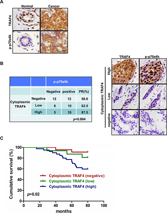 Figure 1: TRAF4 cytoplasmic expression correlates with activation of p70s6k and poor survival in breast cancer patients. (A) Immunohistochemical analysis of TRAF4 and p-p70s6k (T389) localization in normal breast tissue (NBT) and breast cancer tissue (BCT). Bar, 20 μm. (B) The positive rate of p-p70s6k expression was positively correlated with cytoplasmic TRAF4 expression level in breast cancer patients (chi-square test, p = 0.004). Bar, 10 μm. (C) Kaplan-Meier analysis of overall survival curves of cytoplasmic TRAF4 expressions in 80 cases of breast cancer patients was shown. High Cytoplasm expression of TRAF4 significantly correlated with patient poor survival (log-rank test, p = 0.02).