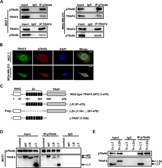 TRAF4 interacted with p70s6k in the erythroleukemia cell line [15]. To confirm whether the interaction between TRAF4 and p70s6k only occurred in specific cells, we tested breast cancer cells MCF7 and MDA-MB-231. Consistent with the previous study, TRAF4 could interact with p70s6k both in MCF7 and MDA-MB-231 (Figure 3A). Moreover, we detected the localization of TRAF4 and p70s6k in MCF7 and MDA-MB-231 by immunofluorescence analysis. As shown in Figure 3B, we found co-localization of TRAF4 and p70s6k both in MCF7 and MDA-MB-231. These results indicate that the interaction between TRAF4 and p70s6k was not a cell specific event, but the p70s6k-interacting region in TRAF4 is still unknown. As shown in Figure 3C, TRAF4 contains a RING domain, seven Zinc finger motifs and a homologous TRAF domain [1, 18, 19]. The N-terminal RING finger motif has potential E3 ubiquitin ligase activity [20, 21, 22]. The TRAF domain is responsible for its interaction with several receptor family members [23]. To analyze the regions important for TRAF4 interacting with p70s6k, the expression vectors for wild type TRAF4, RING, Flag-tagged Zinc fingers, or TRAF domain-deleted mutants were transfected into MCF7. A co-immunoprecipitation experiment was then performed using p70s6k and Flag tag antibodies along with an IgG as control. The RING domain and TRAF domain were dispensable for the interaction, since ΔR and ΔTRAF can still be dragged down by p70s6k antibody (Figure 3D). The Zinc fingers domain deletion mutant (Flag-ΔZn) could not be dragged down by p70s6k antibody. (Figure 3E). These results suggested that Zinc fingers domain was required for TRAF4 interaction with p70s6k.
