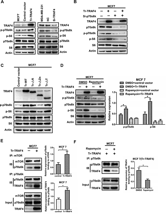 Figure 4: TRAF4 promotes the phosphorylation of p70s6k through enhancing the interaction between mTOR and p70s6k. (A) TRAF4 promotes the phosphorylation of p70s6k and S6. The Western blot analysis indicated that overexpression of TRAF4 in MCF7 significantly increased the phosphorylation of p70s6k/S6 when compared with control vector. While, knocking down of TRAF4 in MDA-MB-231 significantly reduced phosphorylation level of p70s6k/S6 when compared with negative control. (B) TRAF4 promotes the phosphorylation of S6 through p70s6k. p-S6 expression significantly increased after TRAF4 plasmid was transfected into MCF7. while, elevation of p-S6 expression was obviously inhibited when TRAF4 expression vector together with p70s6k specific siRNA were transfected into MCF7. (C) Zinc fingers domain of TRAF4 is responsible for its promoting effect on p70s6k/S6 signaling. The protein levels of p-p70s6k and p-S6 were significantly increased after the expression vectors for wild type TRAF4 (WT), ΔR, and ΔT mutants were transfected into MCF7 cells when compared with control empty vector. But, there were no obvious changes on p-p70s6k and p-S6 protein level after Flag-tagged-ΔZn mutant was transfected into MCF7 when compared with control empty vector. (D) mTOR activity is predominantly required for the promoting effect of TRAF4 on enhancing activation of p70s6k/S6 pathway. The elevation of p-p70s6k and p-S6 expression was obviously inhibited when TRAF4 overexpression together with Rapamycin treatment. The relative expression levels of protein were calculated in reference to Actin as the loading control. (E) TRAF4 promotes the interaction of p70s6k and mTOR. The relative expression of p70s6k binding to mTOR was calculated in reference to mTOR as the loading control. (F) Rapamycin inhibits the interaction between TRAF4 and p70s6k. The expression of TRAF4 that binding to p70s6k was siginificantly reduced in Rapamycin group than that in control group. The relative expression of TRAF4 binding to p70s6k was calculated as (E) Data was presented as mean ± SD from three independent experiments. (*p < 0.05).