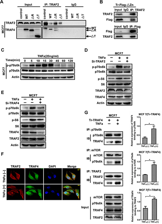 Figure 7: TRAF2 mediates the phosphorylation of p70s6k induced by TNFa, with the participation of TRAF4. (A) The TRAF domain is required for TRAF4 interacting with TRAF2. Wild type, ΔR and ΔT mutants were transfected into MCF7 cells. The cell lysates were then incubated with TRAF2 antibody and protein A/G agarose beads. Western blot was performed to analysis the mutants that co-immunoprecipitation by TRAF2 antibody. (B) The Zinc fingers domain is indispensable for TRAF4 binding to TRAF2 in MCF7. Flag tagged ΔZn mutant was transfected into MCF7 cells, co-immunoprecipitation using TRAF2 or Flag antibody and Western blot were performed as before. Both TRAF2 and Flag could be dragged down by each other. (C) TNFa induces phosphorylation and activation of p70s6k. MCF7 cells were treated with TNFa (20ng/ml) for different time. Western blot was to detect p-p70s6k protein level. The phosphorylation of p70s6k peaked at 15minutes and maintained until 30 minutes. (D, E) Both TRAF4 and TRAF2 play critical role in the activation of p70s6k/S6 pathway induced by TNFa. Koncking down TRAF2 or TRAF4 significantly reduced the activation of p70s6k/S6 pathway induced by TNFa. (F) TRAF2 lies upstream of TRAF4 in TNFa-induced p70s6k pathway activation. The distribution of TRAF2 and TRAF4 after TNFa treatment were detected by immunofluorrescence staining. TRAF2 had obviously distribution of cytosolic side near the cell membrane, and co-localization of TRAF4 and TRAF2 was obviously found in this section after TNFa stimulation. TRAF2 (red), TRAF4 (green), bar, 10 μm. (G) The interactions between mTOR and p70s6k, p70s6k and TRAF2, TRAF2 and TRAF4 were enhanced after TNFa treatment. TRAF4 expression vector was employed into MCF7 together with or without TNFa. The interaction between them were detected by co-immunoprecipitation and Western blotting. After TNFa stimulation, more p70s6k interacted with mTOR, more TRAF4 interacted with p70s6k, more TRAF4 interacted with TRAF2. The relative expression levels of TRAF4 binding to p70s6k, p70s6k binding to mTOR, TRAF4 binding to TRAF2 were calculated as before. Data was presented as mean ± SD from three independent experiments. (*p < 0.05).