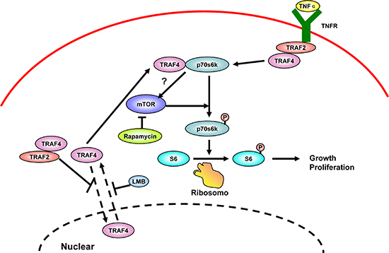 In summary, we demonstrated that cytoplasmic TRAF4 has pivotal roles in regulating the activation of p70s6k signaling in breast cancer. Furthermore, we also identified TRAF2 as the adaptor that mediated the TNFa induced p70s6k activation, with the participation of TRAF4 (Figure 9). These findings greatly advanced our understanding of TRAF4's role in oncogenesis, representing a promising field of future investigation for cancer research and anti-cancer therapeutics, especially in breast cancer.