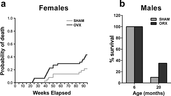 Figure 1: Gonadectomy and life span in female and male mice. (a) Female PPRE-lucRepTOP™ were gonadectomized (OVX, n = 40) or sham-operated (SHAM, n = 40) at 5 months of age. Each group was randomly subdivided into 4 clusters of 10 animals each to be euthanized at 6, 12, 18 and 22 month of age to evaluate the state of inflammation. Predicted cumulative incidence curves for death by natural causes in SHAM and OVX animals were calculated as described in the methodology section. The risk of death by natural causes was significantly higher in ovx mice compared with sham-operated mice (p < 0.05). (b) Male ERE-LucRepTOP™ in the C57BL/6J background were orchiectomized (n = 40) or sham operated (n = 40) at 5 month of age. 20 animals from each group were euthanized at 6 months and 20 months, respectively. Data are expressed as the mean % survival ± SEM.