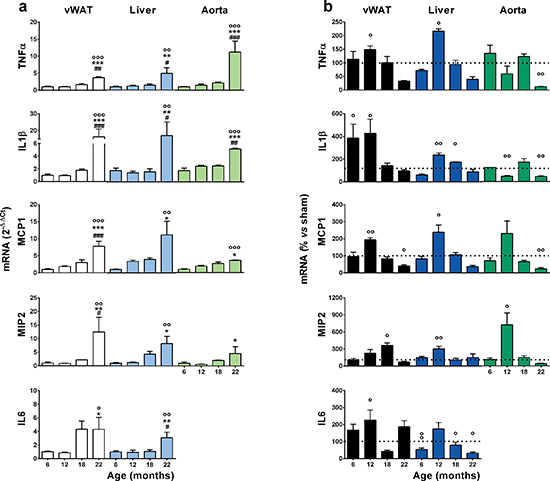 Figure 2: Effects of aging and ovariectomy on the basal state of inflammation in metabolic organs and the aorta. (a) Tissues from sham operated mice collected in Figure 1 were stored until rtPCR analysis. Data are expressed as the mean ± SEM and were analyzed by one-way ANOVA, followed by Bonferroni post hoc test. °P < 0.05; °°P < 0.01, °°°P < 0.001 vs. 6 months; *P < 0.05. **P < 0.01, ***P < 0.001 vs. 12 months. #P < 0.05; ##P < 0.01, ###P < 0.001 vs. 18 months. (b) Data represent the percent change of ovx vs. sham operated mice. Statistical significance was determined by comparing the raw numbers of ovx and sham-operated mice using unpaired t-tests. °P < 0.05; °°P < 0.01, °°°P < 0.001 ovx vs. sham. The experiment was repeated with a second cohort of aged ovx and sham-operated mice with superimposable results.