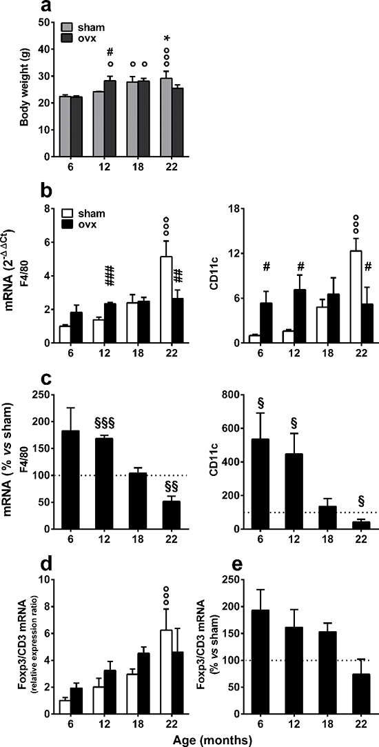Figure 4: Expression of immune response markers in the vWAT of sham-operated and ovx aging mice. (a) The body weight of each mouse was measured before euthanasia. Data were analyzed by two-way ANOVA, followed by Bonferroni’s post hoc test. °P < 0.05; °°P < 0.01; and °°°P < 0.001 vs. 6 months of age; *P < 0.05 vs. 12 months of age; #P < 0.05 vs. age-matched sham operated. (b) F4/80 and CD11c mRNA contents were measured using rtPCR of tissue extracts from the vWAT of sham-operated and ovx female mice. °°°P < 0.001 vs. 6 months of age; #P < 0.05; ##P < 0.01; and ###P < 0.001 ovx vs. sham. Data were analyzed by two-way ANOVA, followed by Bonferroni’s post hoc test. (c) Macrophage activation in vWAT was expressed as the ratio of CD11c to F4/80 mRNA content. Statistical analysis was performed by comparing the raw numbers from ovx and sham-operated mice by two-way ANOVA, followed by Bonferroni’s post hoc test. §P < 0.05; §§P < 0.01; and §§§P < 0.001. (d) The F4/80 and CD11c mRNA content of ovx mice are shown as the percentage of the mean of the sham-operated mice of the same age. Data were analyzed by two-way ANOVA, followed by Bonferroni’s post hoc test. °°°P < 0.001 vs. 6 months of age. (e) Treg content in vWAT was expressed as the ratio of Foxp3 to CD3 mRNA levels. The Foxp3/CD3 ratio of ovx mice was represented as a percentage of the mean of sham-operated mice of the same age. Data were analyzed by two-way ANOVA, followed by Bonferroni’s post hoc test. No statistical significance was found. All data are expressed as the mean ± SEM. Analysis of markers of immunity and body weight was repeated in separate aging experiments with superimposable results.