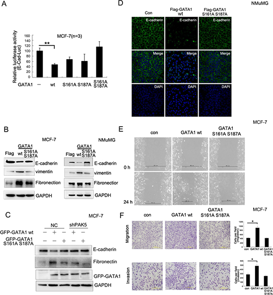 Figure 4: PAK5-mediated GATA1 phosphorylation regulates EMT in breast cancer cells. (A) MCF-7 cells were transfected with wild type or different mutants of GATA1 for Luciferase assay. **p < 0.01. (B) Empty vector, Flag-GATA1 wt or Flag-GATA1 S161A S187A was stably expressed in MCF-7 and NMuMG cells through lentivirus. Cell lysates from these cells were used for immunoblotting using anti-Fibronectin, E-cadherin, vimentin, GAPDH antibodies. (C) Stably knocked down shPAK5 or NC (non-specific control) cells were transfected with GATA1 wt. Western blot analyzed the marker of EMT. (D) The same transfection as (B), NMuMG cells were cultured 24 hours and analyzed by immunofluorescence using anti-E-cadherin antibody followed by Alexa Flour 488 (green) antibody and nucleus was stained by DAPI (blue). (E–F) Effects of different types of GATA1 over-expression on the migration of cultured MCF-7 cells were examined by wound-healing (E) and transwell migration chambers (F) assays. Results are representative of three independent experiments. Migrated cells were plotted as the average number of cells per field of view. In the low lane, transwell migration chambers were treated with 10% matrigel, but not in the top lane. *p < 0.05.