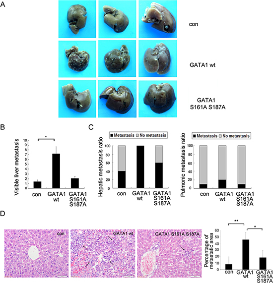 Figure 5: Phosphorylation of GATA1 enhances breast cancer cell metastasis in vivo. 1 × 107 MCF-7 cells stably expressing empty vector, GATA1 wt or GATA1 S161A S187A were injected into nude mice through tail vein. (A) Livers were dissected after injection and macroscopically photographed. (B) Graphical representation of the number of liver metastases from each mouse (mean ± s.d.); *p < 0.05. (C) Effect of MCF7 cells with stable expression of control Flag, Flag GATA1 wt, Flag GATA1 S161A S187A on incidence of liver and lung metastasis. (D) Representative image of H&E-stained liver sections of mice and percentage of metastatic liver surface area relative to tatal live surface area. scale bar, 50 μm. 30 independent visions were counted. *p < 0.05, **p < 0.01.