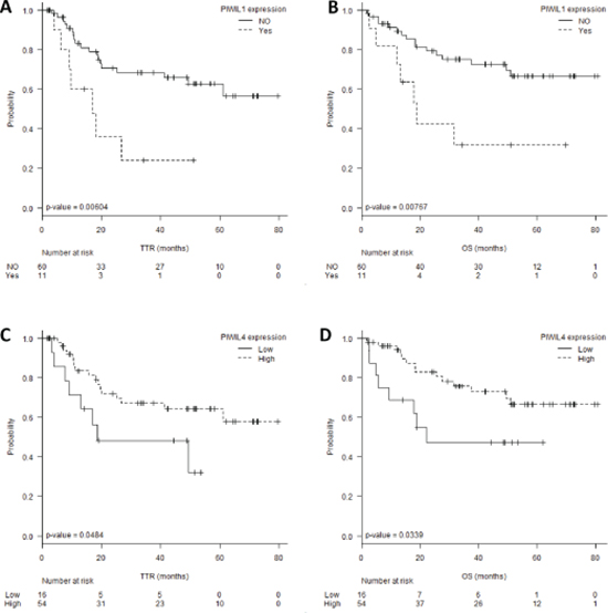 Figure 3: (A) Time to relapse (TTR) and (B) overall survival (OS) according to PIWIL1 expression levels. (C) TTR and (D) OS according to PIWIL4 expression levels.