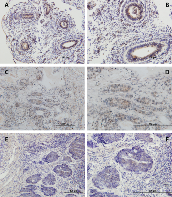 Figure 4: Immunohistochemical analysis of PIWIL1 expression in (A, B) embryonic lung tissue, (C, D) tumor tissue from a patient with squamous cell lung cancer, (E, F) tumor tissue from a patient with lung adenocarcinoma. The images in the right column are a magnification of the images in the left column.
