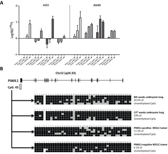 Figure 5: Study of the methylation of PIWI genes in lung cancer. (A) 5-Aza-dC treatment of H23 and A549 lung cancer cell lines showed an increase of the expression levels of the four PIWI genes. (B) Schematic representation of the PIWIL1 gene showing the presence of a CpG island close to the first exon of PIWIL1 gene. The bisulfite sequencing analysis of the 43 CpG island showed differences between a PIWIL1-positive and a PIWIL1-negative case.