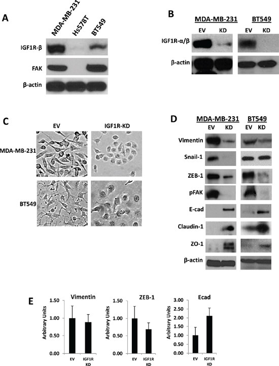 Figure 1: Stable silencing of IGF1R confers epithelial-like phenotypes in mesenchymal TNBC cells. (A) Endogenous expression of IGF1R-β and total FAK analyzed via Western blot analysis in a panel of mesenchymal human TNBC cells. (B) Western blot confirmation of stable lentiviral knockdown of IGF1R-α/β (IGF1R-KD) in MDA-MB-231 and BT549 TNBC cells. β-actin was used as a loading control. (C) Morphological changes in MDA-MB-231 and BT549 IGF1R-KD cells compared to EV control cells four to six passages post-lentiviral infections; brightfield magnification x20. (D) Western blot analyses of mesenchymal markers (vimentin, Snail-1, ZEB-1), motility marker pFAK, and epithelial markers (E-cadherin, claudin-1, and ZO-1) in cell lines stably expressing EV control plasmid or IGF1R-KD lentiviral plasmids using specific antibodies. β-actin was used as a loading control. (E) Relative mRNA expression levels of Vimentin, ZEB-1, and E-cadherin in MDA-MB-231 EV and IGF1R-KD cell lines was detected by TaqMan quantitative RT-PCR and normalized to RPLPO. The relative amounts of transcript were described using the 2–ΔΔCt method. Data are displayed in means ± standard deviation of at least three independent experiments of each group.