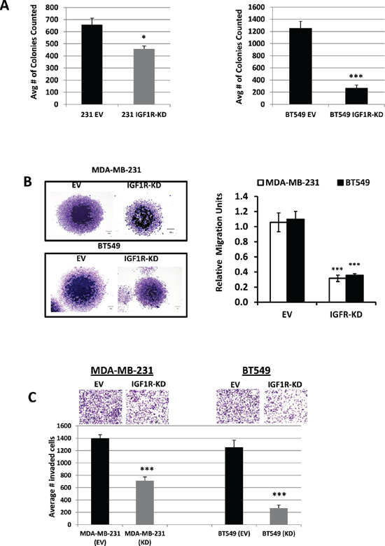 Figure 2: Inhibition of IGF1R suppresses TNBC cell colony formation, migration, and invasion. (A) Colony formation assays using MDA-MB-231 and BT549 EV-control and IGF1R-KD cells; colonies counted contained at least > 50 cells/colony. Data are representative of the average of at least three independent experiments performed in triplicate. *p = 0.042 and ***p < 0.001 compared to EV control cells. (B) Evaluation of in vitro cell migration potentials of MDA-MB-231 and BT549 EV-control and IGF1R-KD cells by spheroid migration assay. Representative images (left, magnification x20) and the mean relative migration (±S.D.) in five different spheroids (right) are shown. ***p < 0.001 compared to EV control cells. (C) Representative images of cell invasion assays of MDA-MB-231 and BT549 EV control and IFG1R-KD cells plated in the upper chambers of Transwell units coated with Matrigel. Fetal bovine serum and fibronectin was used as chemo-attractants in the lower chambers. The results are expressed as the average number of invaded cells per field of view (means ± S.D.; n = 6). ***p < 0.001 compared to EV control cells.