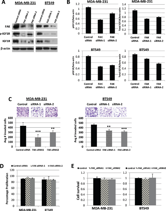 Previous studies have shown that FAK regulates IGF1R stability and auto-phosphorylation in several human cancer cells [23, 28]. Based on our observation that phosphorylated FAK levels were decreased in response to IGF1R silencing (Figure 1D), we sought to determine if FAK also regulated IGF1R activity in TNBC cell lines. We found that in both MDA-MB-231 and BT549 cells, siRNA-mediated FAK silencing resulted in decreased FAK expression and down-regulation of active and total IGF1R (Figures 3A and 3B). Further, we examined the effect of FAK silencing on in vitro cell invasion. Using Matrigel invasion assays, we found that MDA-MB-231 and BT549 cells with transient FAK knockdown exhibited a significant reduction in invasion (p < 0.001) as compared with cells treated with control siRNA (Figure 3C). We further demonstrated that these observed effects on invasion were not the result of differences in proliferative potential (Figure 3D) or influences on cell survival (Figure 3E).