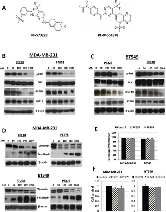 Figure 4: Effects of FAK-specific inhibitors on IGF1R activity, invasion, and EMT-related protein expression in TNBC cells. (A) Chemical structures of two FAK tyrosine kinase inhibitors, PF-573228 and PF-04554878. The expression of pFAK, FAK, pIGF1R, and IGF1R were assessed via immunoblotting analysis in (B) MDA-MB-231 and (C) BT549 TNBC cells following treatments with indicated doses of PF228 and PF878 for 24 h. (D) Vimentin and E-cadherin expressions examined via Western blotting following treatments as indicated above. β-actin served as a loading control. (E) MDA-MB-231 and BT549 cells were treated with 0.5 μM PF228 or 0.5 μM PF878 for 24 h. Cells were counted by trypan blue exclusion; data represented as a percentage of the vehicle treated (DMSO) control groups. The results represent the average of triplicated treatment groups performed at least three times with reproducible results. (F) Cell lines were treated with 0.5 μM PF228 or 0.5 μM PF878 for 24 h and the effects on cell survival was measured by SRB assays. The data represent mean growth inhibition compared to vehicle treated (DMSO) control cells for three independent experiments for each cell line.