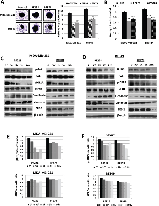 Figure 5: FAK-specific inhibitors suppress spheroid migration, decrease IGF1R phosphorylation, and alter EMT-marker expression levels in TNBC cells. (A) Spheroid cell migration assays were performed to analyze the migration potential of MDA-MB-231 and BT549 cells treated for 24 h with vehicle control (DMSO), 0.5 μM PF228 or 0.5 μM PF878. Representative images (left, magnification x10) and the mean relative migration (±S.D.) of five different spheroids (right) are shown. ***p < 0.001 compared to untreated control cells. (B) Transwell cell invasion assays of MDA-MB-231 and BT549 cells treated with vehicle control (DMSO), 0.5 μM PF228, or 0.5 μM PF878 for 24 h. The histograms show the average number of invasive cells (error bars represent S.D. of three independent experiments, each performed in replicates of five). ***p < 0.001 compared to control cells. Total protein lysates from (C) MDA-MB-231 and (D) BT549 cells treated with vehicle control (DMSO), 0.5 μM PF228 or 0.5 μM PF878 for various time points (0, 30’, 1 h, 3 h, and 24 h) were analyzed via Western blotting for expression of pFAK, FAK, pIGF1R, IGF1R, E-cadherin, vimentin, and ZEB-1. β-actin served as a loading control. Quantified data of pIGF1R and total IGF1R levels, normalized to β-actin for (E) MDA-MB-231 and (F) BT549 cells. Means and SDs of three separate experiments are shown.