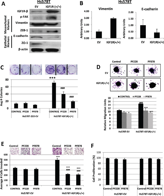 Figure 6: Inhibition of FAK abrogates IGF1R-mediated colony formation, migration, and invasion in TNBC cells. (A) Lysates of Hs578T TNBC cells stably expressing empty vector (EV) control or IGF1R-β expression plasmid (IGF1R +/+) were immunoblotted with specific antibodies for IGF1R-β, p-FAK, Vimentin, ZEB-1, E-cadherin, ZO-1, and β-actin loading control. (B) Relative mRNA expression levels of Vimentin and E-cadherin in EV and IGF1R(+/+) TNBC cell lines were detected as described above. Data are displayed in means ± S.D. of at least three independent experiments of each group. (C) Colony formation, (D) spheroid migration, and (E) Matrigel invasion assays were performed as described above on Hs578T TNBC cells expressing either empty vector (EV) control or overexpressing full-length IGF1R-β (IGF1R +/+) followed by treatments with DMSO (control), 0.5 μM PF228, or 0.5 μM PF878 for 24 h. ***p < 0.001 compared to Hs578T-EV untreated controls; ###p < 0.001 compared to Hs578T-IGF1R(+/+) untreated cells. (F) Hs578T (EV) and Hs578T-IGF1R(+/+) cells were treated with 0.5 μM PF228 or 0.5 μM PF878 for 24 h and cells were counted by trypan blue exclusion. Data represented as a percentage of the vehicle treated (DMSO) control groups. The results represent the average of triplicated treatment groups performed at least three times with reproducible results.